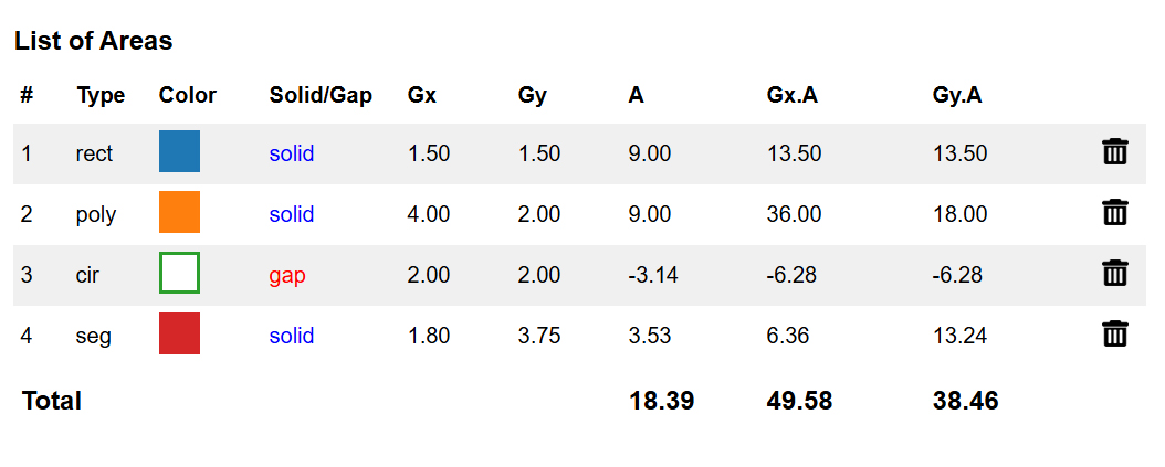 Once areas and gaps are added, a table is displayed containing Type, Color, Solid/Gap, Gx, Gy, Area, Gx.A, Gy.A and also total values for Area, Gx.A and Gy.A values. To remove an area, simply click the delete icon in its row.