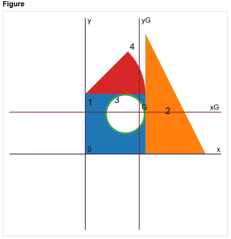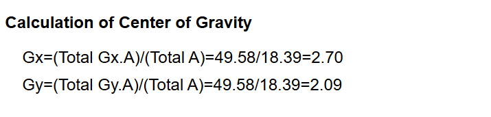 After summing the total area values, the center of gravity coordinates are calculated as: